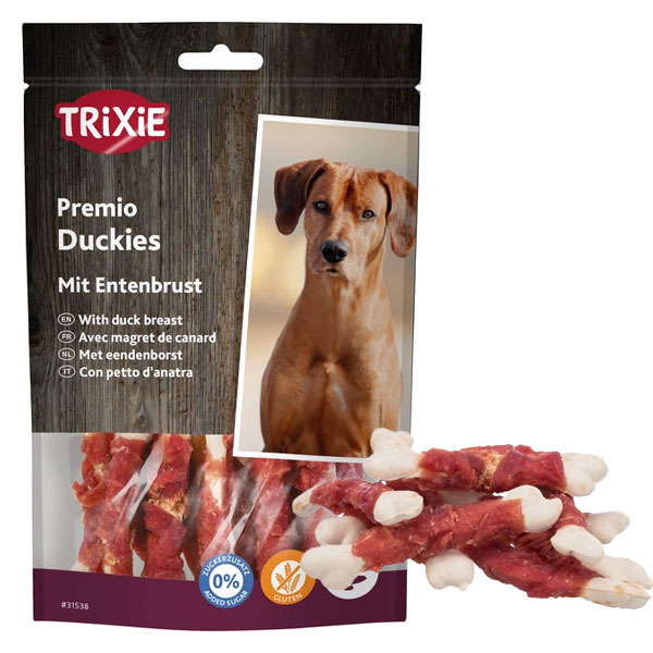 تشویقی سگ تریکسی مدل استخوانی با دورپیچ گوشت اردک - وزن (100 گرم)