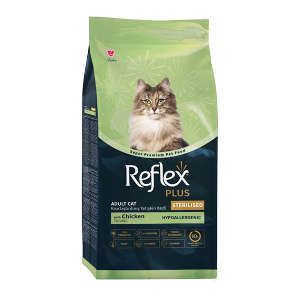 غذای خشک گربه عقیم شده رفلکس پلاس (Reflex Plus Adult Cat Sterilised Chicken) حاوی گوشت مرغ، یک غذای کامل، مغذی و تامین کننده تمامی نیاز به پروتئین، ویتامین و مواد معدنی و مناسب گربه های بالغ عقیم می باشد. غذای خشک گربه عقیم شده رفلکس پلاس حاوی مرغ، سیستم ایمنی بدن و وزن را کنترل می کند. و همچنین به کاهش بیماری ادراری کمک می کند. فرمول این غذا حاوی سطح متوسط چربی و اسید چرب EPA که به تقویت سیستم کلیه و ادرار کمک می کند و همچنین برای کمک به محدود کردن افزایش وزن با هیچ تغییری در میزان پروتئین، کلسیم و فسفر مورد نیاز برای رشد سالم گربه عقیم شده در کنار تقویت سیستم ایمنی و ادرار گربه می باشد.