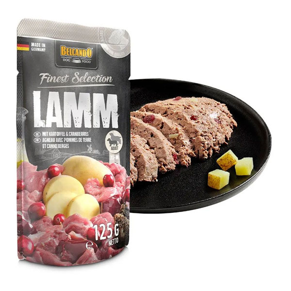 پوچ سگ بلکاندو طعم گوشت بره با سیب زمینی و کرنبری - وزن (125 گرم)