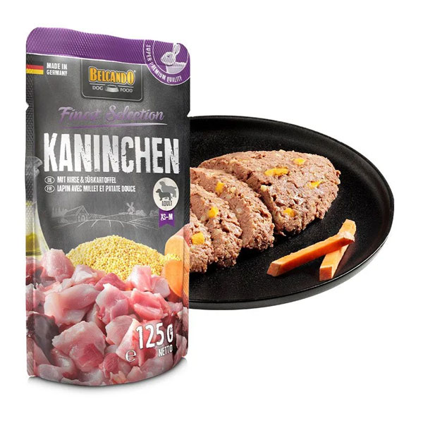 پوچ سگ بلکاندو طعم گوشت خرگوش با ارزن و سیب زمینی شیرین - وزن (125 گرم)