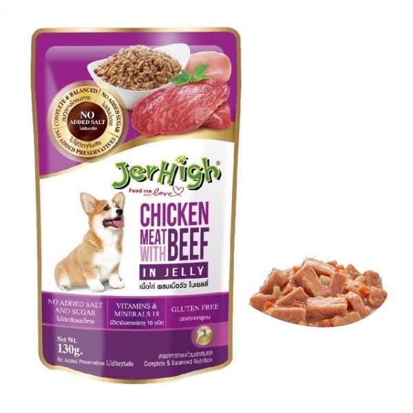پوچ سگ بالغ جرهای با طعم مرغ و گوشت گاودر ژله(Jerhigh Pouch Adult Wet Dog Food With Chicken & Beef In jelly)، با تکه های گوشت گاو که سگ ها آن را با اشتیاق میخورند باعث می شود حتی بدغذا ترین سگ ها هم نتوانند از آن بگذرند. پوچ مخصوص سگ بالغ جرهای از گوشت گاو و مرغ کبابی در سس فرموله و تهیه شده است. این محصول با دقت بسیاری تهیه و تولید می شود تا سگ شما از یک وعده غذایی پر از طعم های طبیعی، خوشمزه و با قابلیت هضم سریع لذت ببرد. پروتئین و ویتامین های طبیعی موجود در تکه های کامل گوشت گاو در سس به داشتن موهای سالم و براق سگ کمک بسزایی می کند.