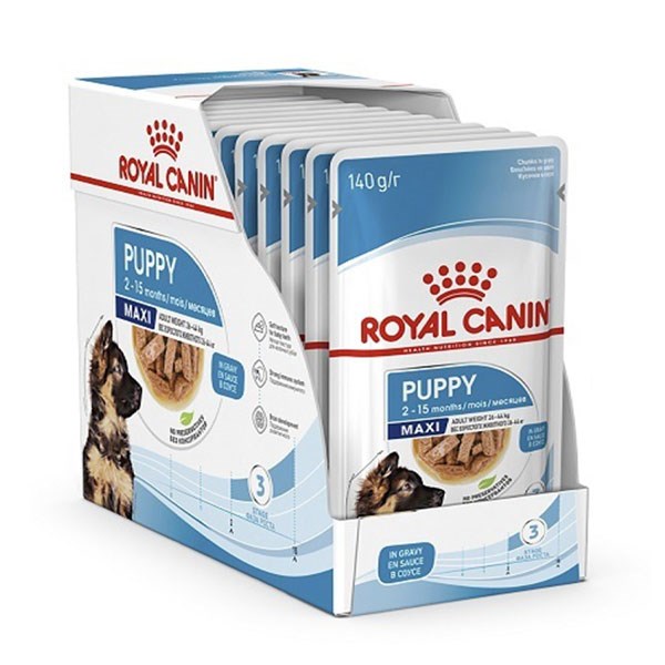 پوچ مکسی پاپی رویال کنین یا Maxi Puppy Wet برای توله سگ نژاد بزرگ تا سن 15 ماهگی با وزن بالغ 26 تا 44 کیلوگرم تولید شده است.