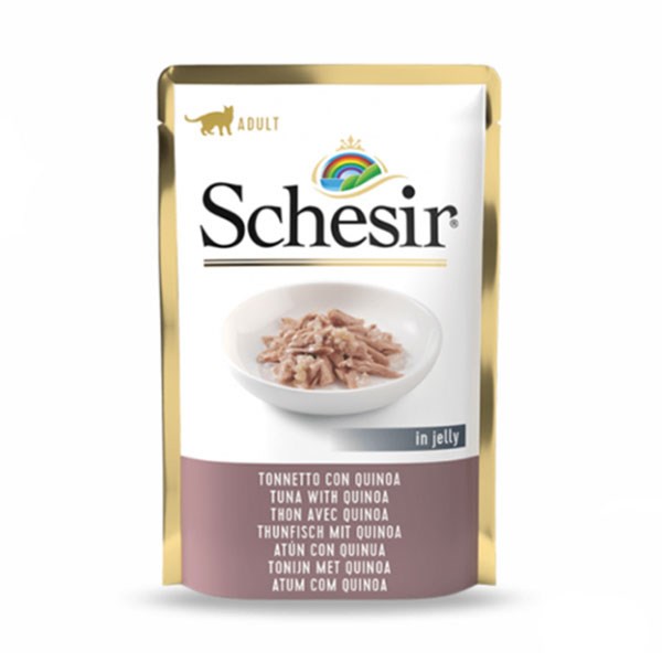 این دستور العمل خوشمزه Schesir از ماهی تن و کینوا در ژله تهیه شده است تا طعمی دلچسب را به همراه داشته باشد. بافت این غذا بصورت ژله ای است تا گربه هایی را که طعم طبیعی را ترجیح می دهند، با قوام فشرده تر نسبت به بافت های دیگر در ظرف غذا راضی باشند و به راحتی غذا را نوش جان کنند.