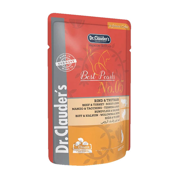 پوچ گربه دکتر کلادرز طعم گوشت گاو و بوقلمون در ژله - وزن (100 گرم)