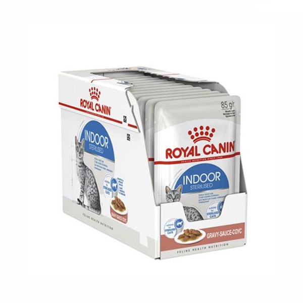 پوچ گربه رویال کنین مدل ایندور (Royal Canin Indoor Sterilised Wet Pouch) وزن ۸۵ گرم گرم غذای گربه بالغ عقیم شده کم تحرک خانگی می باشد که توسط شرکت رویال کنین تولید شده است و حاوی ویتامین ها و مواد معدنی ضروری مورد نیاز برای گربه های عقیم شده است.گربه ها حیواناتی گوشت خوار هستند که برای رفع نیازهای خود به میزان پروتئین بالایی در رژیم غذاییشان نیاز دارند. غذاهایی که پروتئین بالایی داشته باشند می توانند برای آن ها بسیار مفید باشند. غذاهای پوچ که رطوبت بسیار بالا و در حدود ۸۰% دارند، به خوبی نیاز غذایی گربه ها به رطوبت را رفع می کنند و برای بهبود عملکرد دستگاه ادراری آن ها تاثیر به سزایی دارند.