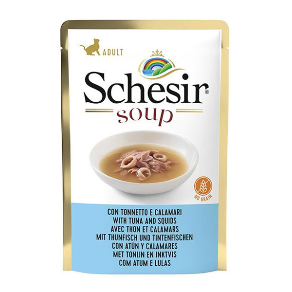 پوچ گربه شسیر با طعم ماهی تن و ماهی مرکب در سوپ - وزن (85 گرم)
