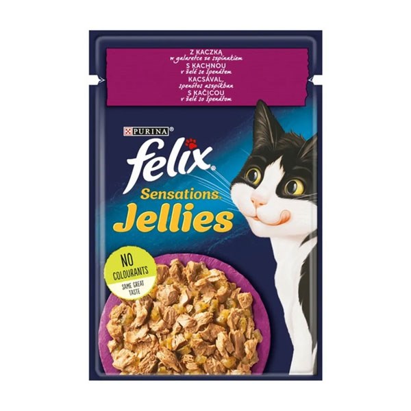 گربه ها حیوانات گوشتخوار هستند و رژیم غذایی بر پایه گوشت برای سلامتی آنها مفید است. پوچ گربه فلیکس با طعم اردک در ژله، عمدتا شامل آب، پروتئین و چربی است که محتوای آن کمتر از ۱۰٪ کربوهیدرات باشد. پوچ فلیکس حاوی تکههای رشتهای و لذیذ گوشت در ژله با ظاهر، بو و طعم بسیار لذیذ برای بچه گربههای سختگیر است.این غذا همچنین باعث تقویت پوست و مو شده و ویتامین های آن باعث رشد، تقویت و زیبایی موی گربه ها می شود. این محصول دارای سازگاری با دستگاه گوارش و شامل محتوایی غنی از پروتئین ها و پروبیوتیک های زود هضم است که از بیماری های گوارشی و روده از جمله یبوست جلوگیری می کنند. این پوچ سازگاری کامل با سیستم دفع ادرار گربه داشته و از مشکلات دفع ادرار از جمله سنگ کلیه یا عفونت جلوگیری میکند.