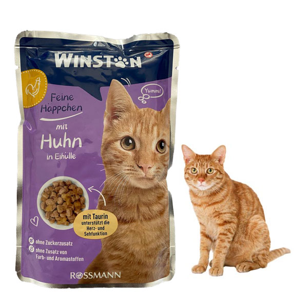پوچ گربه وینستون طعم مرغ و تخم مرغ برای گربه های بالغ بد غذا تولید شده؛ غنی از تورین و بیوتین و فاقد قند، رنگ و مواد نگهدارنده است.