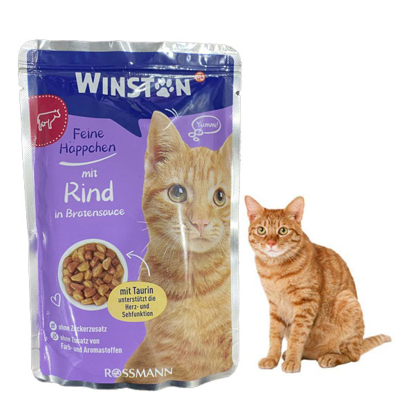 پوچ گربه وینستون طعم گوشت گاو در سس گوشت برای گربه های بالغ بد غذا تولید شده؛ غنی از تورین و بیوتین و فاقد قند، رنگ و مواد نگهدارنده است.