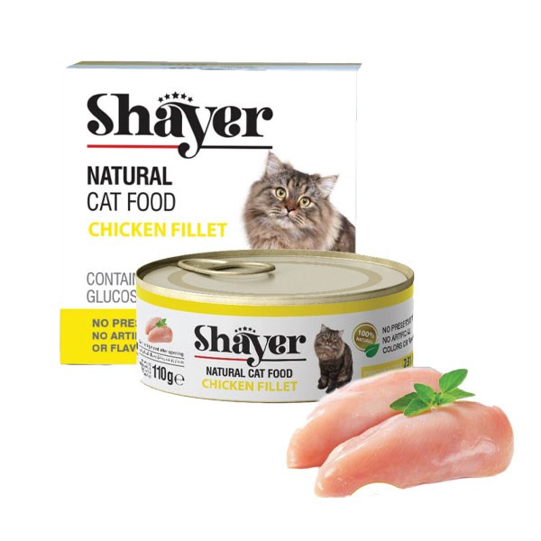 کنسرو گربه “شایر” با طعم فیله مرغ “۱۰۰% نچرال” ، شامل تکههای طبیعی فیله مرغ و مقداری برنج است. برنج حاوی ویتامین C، ویتامین A و ترکیبات فنولیک و فلاونوئیدهای فراوانی است که به پاکسازی بدن کمک میکند. این کنسرو بدلیل کاملا طبیعی بودن و میزان بسیار اندک چربی و میزان مناسب پروتئین، برای تمامی سنین گربه ها از ۵ ماهگی به بعد، استفاده میشود.