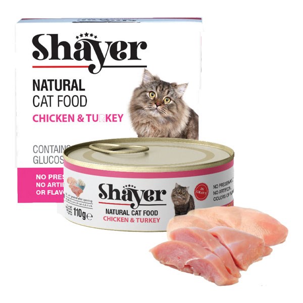 کنسرو گربه “شایر” با طعم مرغ و بوقلمون حاوی گوشت مرغ و بوقلمون همراه با جگر، کمی برنج، هویج، نخود سبز،کلم و استخوان میباشد.