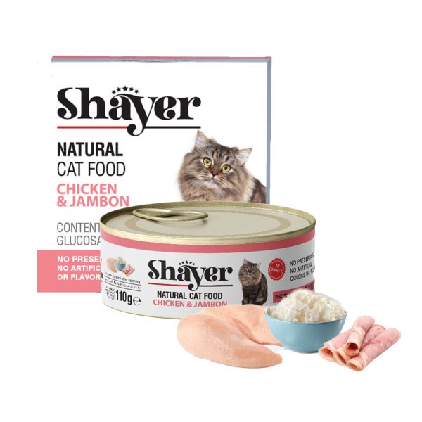 کنسرو نچرال گربه “شایر” با طعم مرغ و ژامبون حاوی گوشت مرغ و ژامبون همراه با جگر، کمی برنج، هویج، نخود سبز،کلم و استخوان میباشد.