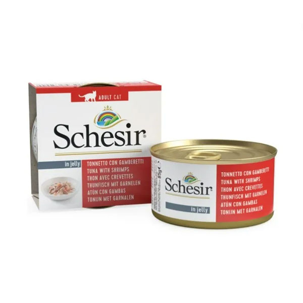 کنسرو گربه شسیر با طعم ماهی تن و میگو Schesir Tuna With Shrimps از گوشت تازه و مرغوب تولید شده و فاقد هر گونه مواد غذایی مصنوعی است.